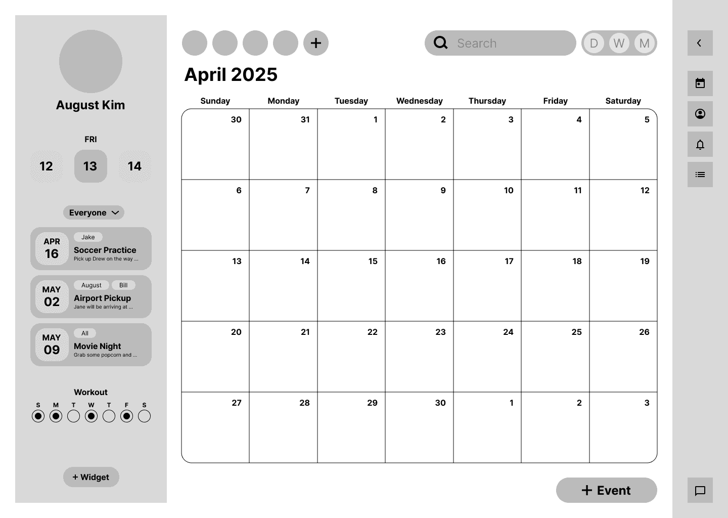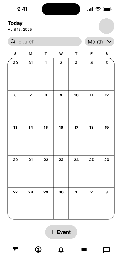 The calendar serves as the core of this wireframe, with the rest of the navigation designed to support and build around it.