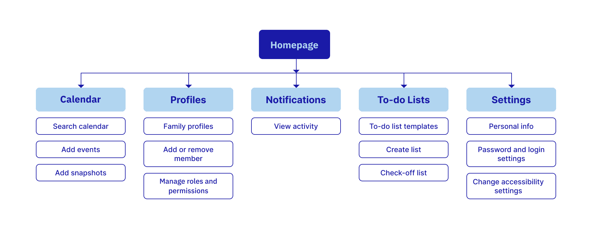 For this family calendar app, I grouped features into logical categories—such as Calendar, Profiles, Notifications, To-do Lists, and Settings—so users can easily navigate between core functions.